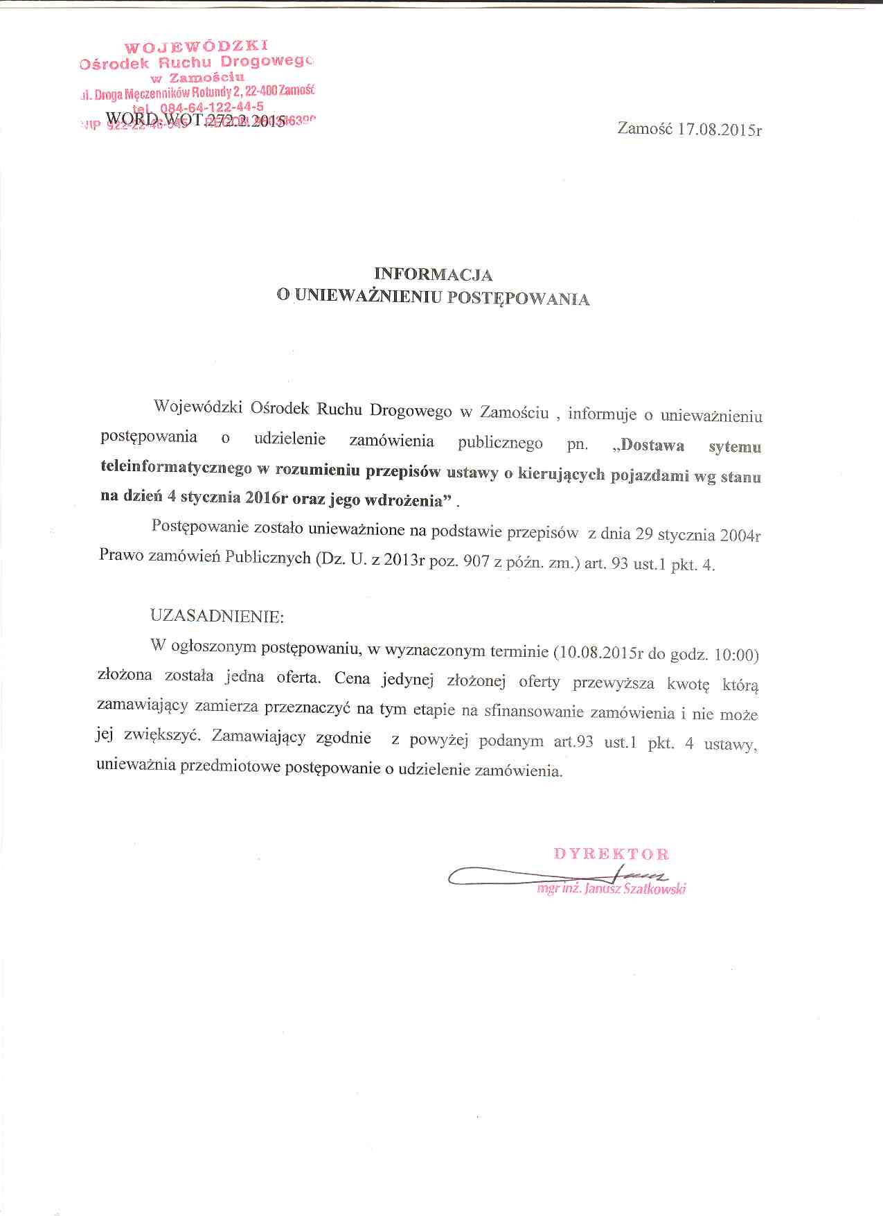 powrót do listy przetargówDostawa systemu teleinformatycznego w rozumieniu przepisów ustawy o kierujących pojazdami wg. stanu na dzień 04.01.2016r oraz jego wdrożenie